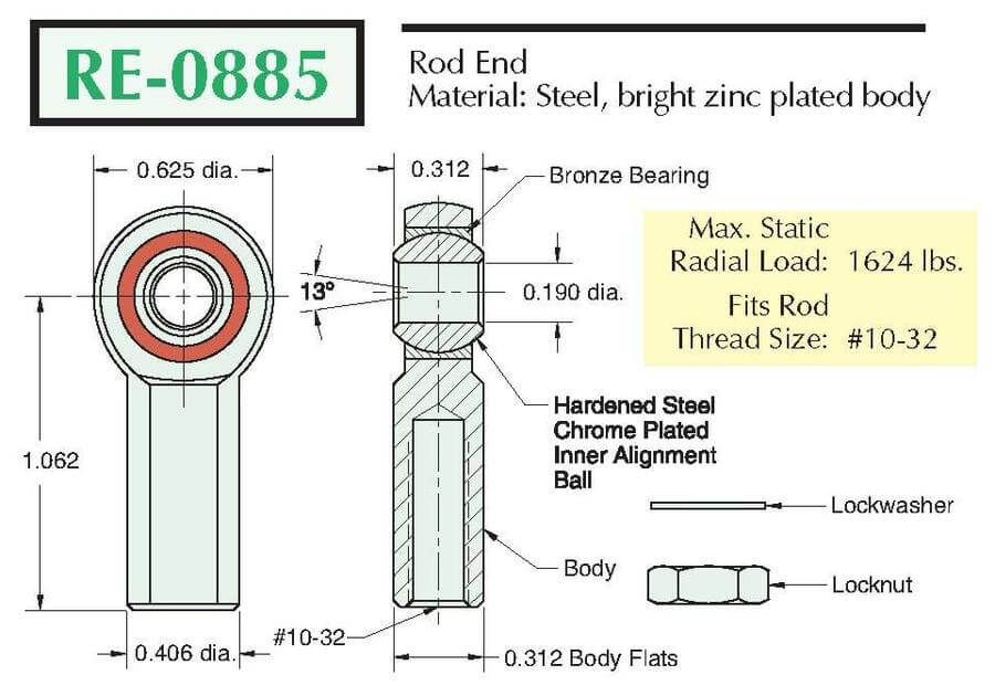 Please Notice: Item(s) that qualify will ship out the same day as long as the order is received before 1:00 PM EST (Monday-Friday), orders received after 1:00 PM are not guaranteed same-day shipment. Orders received after 1:00 PM EST on Friday will ship the following Monday. If you have questions regarding stock availability please call us at 1-800-277-4466 before placing an order.Spherical Rod End, #10-32 Thread, 1/2″ & 5/8″ Series